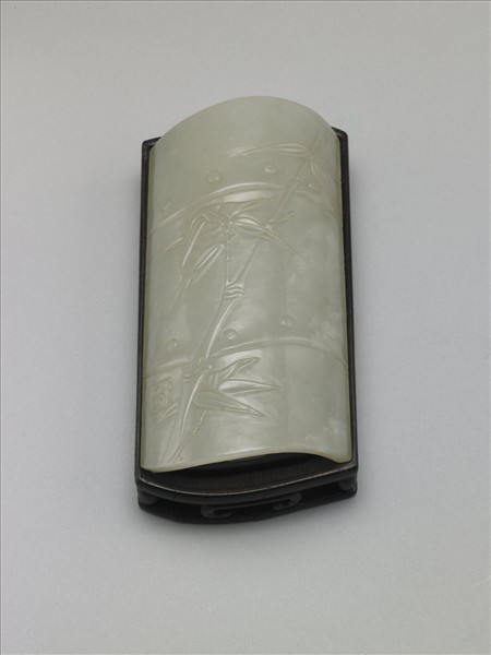 玉質,製如重剖的一段竹幹。隆起面以陰線琢竹節與節瘢,浮雕陽文的竹枝由左下向右上斜伸。左下方具陽文篆款方印︰「子剛」,所以本件可能是陸子剛的作品或後是仿品。圖案結構近似冊頁式的繪畫小品。陸子剛,明嘉靖間太倉人。以善雕玉著稱,為當時能與縉紳並坐抗禮的名匠之一。傳世玉器托其名款者甚多。其款字有作子剛、子岡、子崗者,陰刻、陽文俱備,字體各異。
