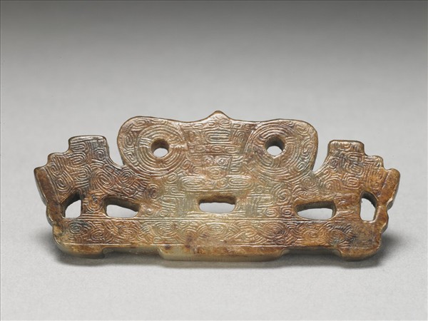 本件良渚文化獸面紋玉飾,或認為是「大眼面紋」意指「神靈動物面紋」,考古報告多稱之為「神獸紋」。這類紋飾多以浮雕配合陰線,雕琢於良渚玉器上。但如此例直接以大眼面紋作為一件玉器造形的,並不多見。它可能是良渚文化冠狀器,流傳到明代晚期時被玉工改製了下緣,明代玉工不但將器表紋飾加刻深,還在器的上、下窄邊,加刻明代仿古幾何紋飾,如「回紋」等。