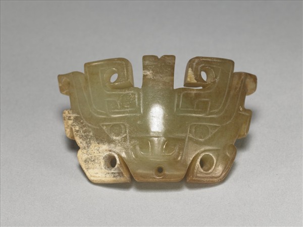 青玉龍面紋玉飾,器身呈圓弧片狀,表面陰線刻劃紋飾,有一雙正面凝視著的威猛眼神。