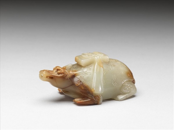 本器形象來自神龜負書之傳說,玉質晶瑩細潤,沁處呈淺棕黃色。神龜作伏臥式,負洛書,頂生雙角,首望前方。