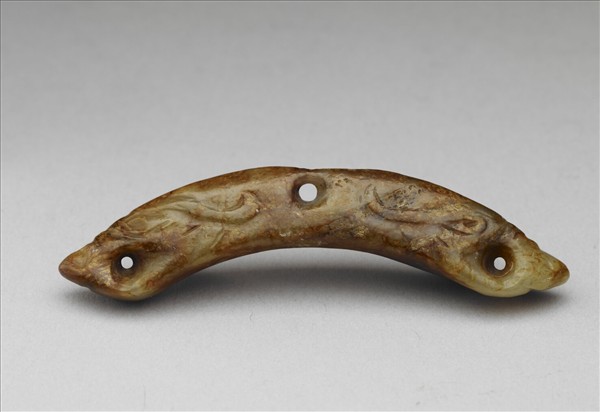 這件雙龍首璜中央上端有供繫掛的小孔,二端在龍口的位置鑽鑿圓孔,再以斷續細陰線與淺浮雕技法標現似長眉般的飄鬣。可能於晚明至清初時被沁染成褐色。