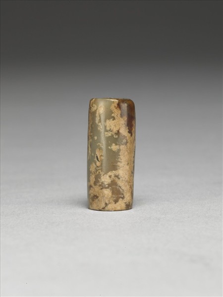 玉管,由青玉雕刻而成,受沁染而夾雜深淺褐色斑塊。全器呈短圓管狀,由兩端鑿孔貫穿,孔徑由兩端往中央漸收。一端切口略為歪斜。