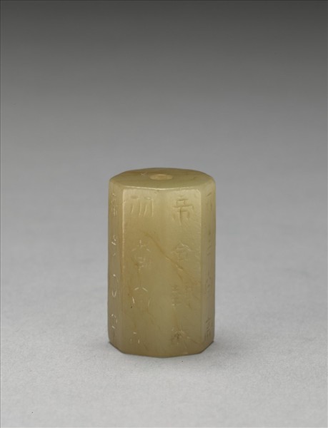 玉剛卯,色青白,夾雜些許黃褐色絲紋,帶半透明之感。全器呈八角短柱形,中央有一小孔貫穿,稜角略經削磨。器外壁各面均陰刻辟邪詞句,一面一句、一句四字,共計三十二字。剛卯為漢代特有之厭勝物,外形作長方柱狀,柱中有通心穿,可供線繩穿繫佩帶;四面刻有文字,多為驅逐疫鬼、消災避禍之辭。由於其一般製作於正月卯日,器身上所刻文字首句常為「正月剛卯」,故以「剛卯」為名。剛卯流行於漢代,後世偶有仿作,造型稍具差異。