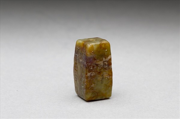 玉剛卯,色灰青,夾雜深淺褐色絲紋。全器約呈長方柱形,器身歪斜不整,中央有一孔貫穿,稜角略經削磨。器外壁各面均陰刻辟邪詞句,一面二句、一句四字,共計三十二字,然器表磨損嚴重、內容難以辨識。剛卯為漢代特有之厭勝物,外形作長方柱狀,柱中有通心穿,可供線繩穿繫佩帶;四面刻有文字,多為驅逐疫鬼、消災避禍之辭。由於其一般製作於正月卯日,器身上所刻文字首句常為「正月剛卯」,故以「剛卯」為名。剛卯流行於漢代,後世偶有仿作,造型稍具差異。