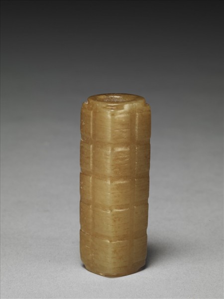 玉管,受沁染而多作黃褐色。器形似「琮」,呈方柱體,上下端均有圓形淺射口,圓孔貫通器身。外壁等距刻有凹槽數道,將器表橫向分為四節、直向分為五節,多處輪廓及紋飾已模糊難辨。