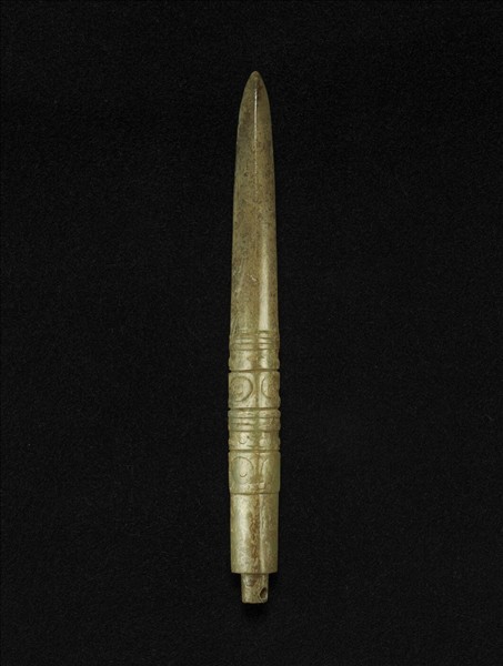 雕有紋飾的方柱形錐形器是良渚文化特有的玉器,良渚文化早期的高級墓葬中,墓主冠帽上常常插著多個光素圓柱形的錐形器,中央配有一件雕了花紋的方柱形錐形器。院藏的這件方柱形錐形器相當長大,方柱的中下段,自上至下琢有兩節各兩組「小眼面紋-大眼面紋」,眼面紋的中線分別在不同的轉角上。