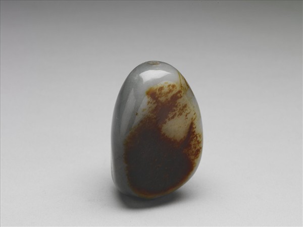 玉鼻煙壺,器身無特別雕琢,僅以天然玉子鑿一小洞成器;色灰青,有褐斑。缺蓋、匙。
