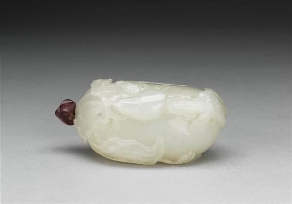 玉鼻煙壺,器身雕成飽滿茄狀,無口無足,僅在蒂頭處鑿洞成器;茄上浮雕蜻蜓與蝴蝶紋,帶紅寶石蓋與牙匙。