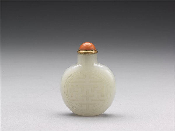 玉鼻煙壺,直圓口,球形扁腹,無足;玉色灰白溫潤,一面淺浮雕梧桐樹、雙雉等,另面浮雕團卍壽字。帶銅嵌珊瑚蓋與牙匙。