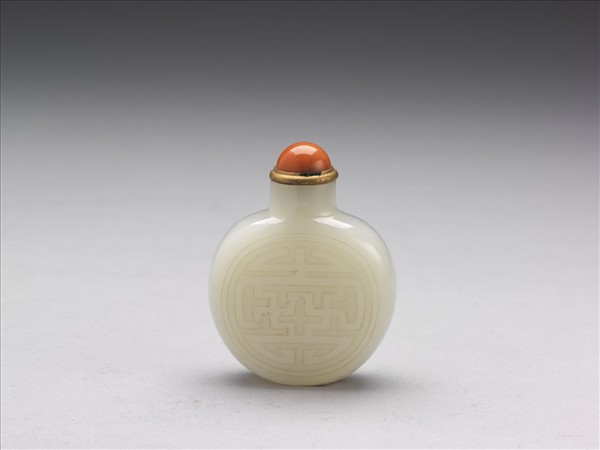 玉鼻煙壺,直圓口,球形扁腹,無足;玉色灰白溫潤,一面淺浮雕雙竹,下立相視雙鶴,旁雕靈芝,另一面淺浮雕團卍壽字。帶銅嵌珊瑚蓋與牙匙。