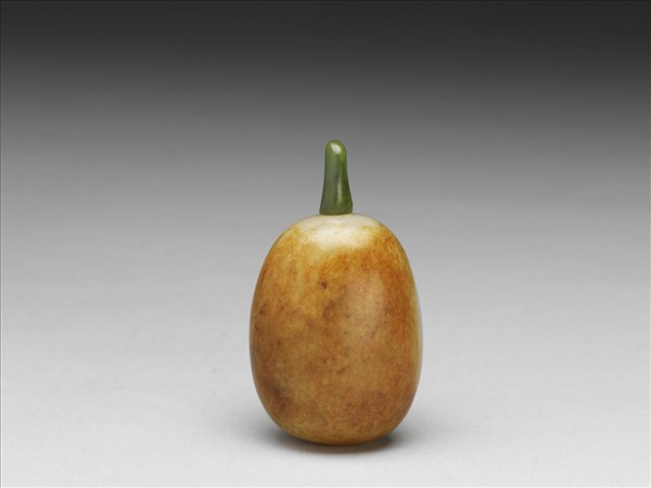 玉鼻煙壺,略琢成茄式,白玉遍沁土黃斑,通體光素。帶碧玉茄蒂式蓋與牙匙。