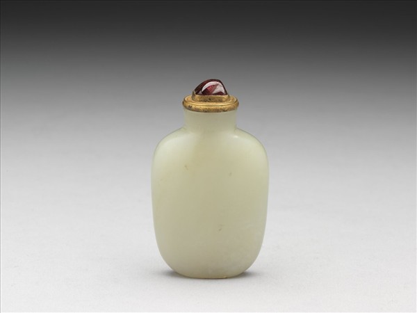 玉鼻煙壺,直圓口,豐肩,壺身扁平,長直腹至底部內斂,無足;玉色灰白溫潤,通體光素。帶銅嵌碧璽蓋與牙匙。