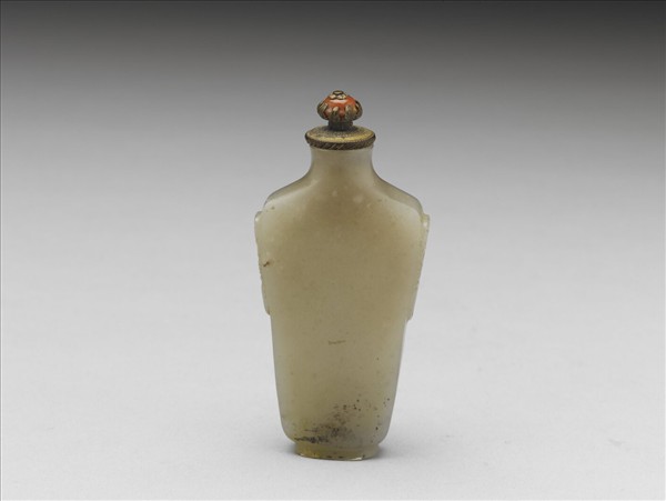 玉方扁瓶,短頸,斜折肩,倒梯形腹,方圈足外撇。 瓶身光素,僅兩肩浮雕獸首銜環。帶銅嵌珊瑚蓋與銅匙。