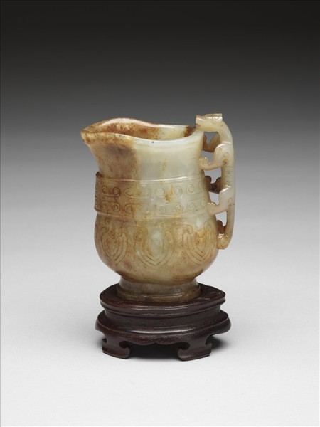器形仿自三代銅觥加以變形,圈足,立雕螭把,不宜把持,似屬裝飾性。環腹飾以雲紋、垂葉紋。器身局部先腐蝕或戳傷,再上藥料呈不均勻的褐紅色,花紋刻槽處有積藥料。