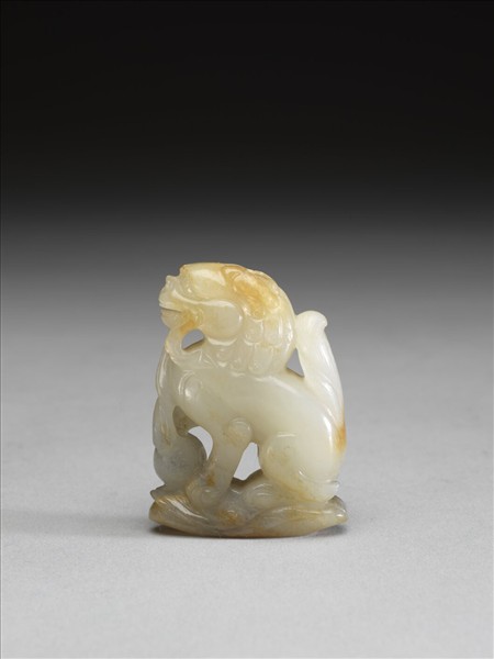 玉獅,作立姿,頭微仰,睜眼、張口齜牙貌,嘴巴兩側有長鬚,尾巴上揚,右腳搭於繡球上。頭部、尾雕飾弧形曲線紋飾,表現鬃毛的豐厚感,四足指爪與關節處雕琢細緻。玉質帶綹,頭部與四肢有局部烤皮褐斑。帶鏤空雕樹石木座一只。原存放在院藏〈紫檀木鑲竹絲轉盤格子〉(故雜1284)中。