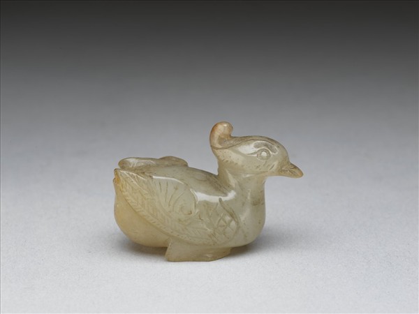 玉色微帶黃,雕作鴛鴦造型,以陰刻線加強描繪羽翅。一側有局部赭色。木座雕成荷葉形。貯在院藏〈紫檀木鑲竹絲轉盤格子〉(故雜1284)格層裡。