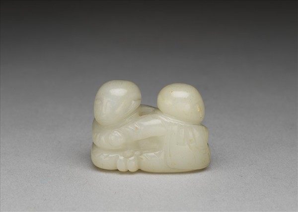玉質,雕一對童子,皆光頭,頂上梳桃形髮式。童子盤坐,相互拉住對方手臂,擺頭各朝向左右方向。衣紋線條簡單,附木座。貯在院藏〈紫檀木鑲竹絲轉盤格子〉(故雜1284)格層裡。