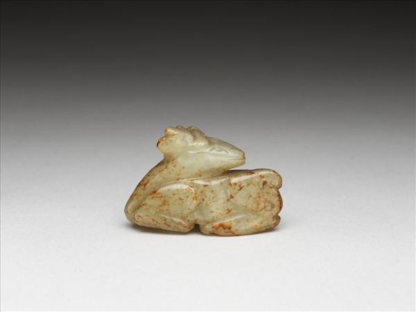 玉雕回首跪臥鹿形,玉質有綹。頭部、身形體態略施琢痕,以表現角、眼與肌肉。附深棕色木座,木座帶直邊,邊緣雕滿相交重疊的細長葉形紋飾,玉鹿放置其上似跪臥在草葉堆上。貯在院藏〈紫檀木鑲竹絲轉盤格子〉(故雜1284)裡。