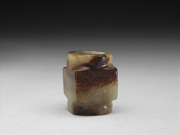 玉質,局部泛青色或褐色,帶大片褐色斑。琢作一方柱形之外方內圓的小玉琮,四面平直,射頸略長,射口內圓外不圓,整體觀之微有傾斜。光素無紋。附方座。貯在院藏〈紫檀木鑲竹絲轉盤格子〉(故雜1284)。