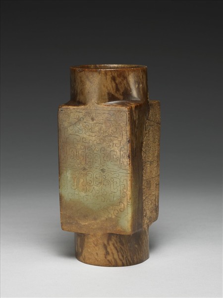 全器呈方柱體,上下端圓形射口略長,中有圓孔貫通器身,作工平整,為內圓外方「琮」形。此作為新石器時代祭祀用的玉禮器,在乾隆時期並未被辨識出來,而以玉杠頭稱之。原本光素的外表在明代被染上了褐色,並加上了細密清淺的獸面雲紋。