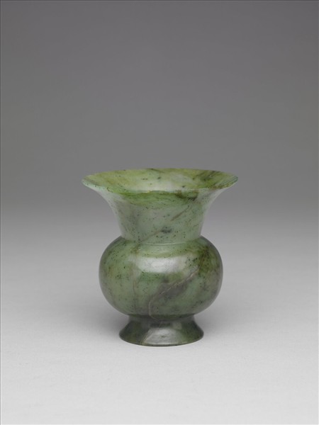 玉質,帶棕色與深綠之斑紋,器表密佈深綠色點,全器琢成一渣斗器形,侈口,長頸,圓腹,撇圈足。全器光素無紋。帶一木盒。故玉5704、故玉5705為一組,置於故玉5704N1盒中。