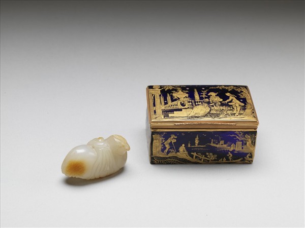 半透明藍色描金玻璃長方盒,盒身具菱格切面,四面與盒蓋以金彩描繪歐洲風景人物場景,並以陰刻細線表現細節,玻璃切面與金彩有映光交輝的華麗質感,為歐洲作品。此件盛裝一件玉鳥,存貯於一件金漆提盒中。