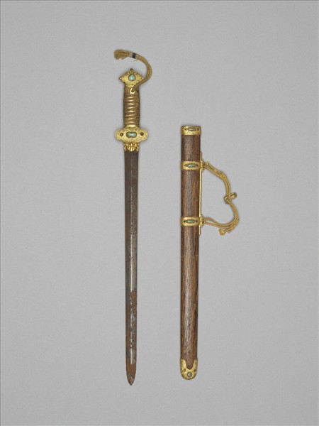 此件收於〈琅玕聚〉百什件中,目錄著錄為〈沉香鞘嵌珠松石古劍〉,此劍器型雖小,但每一部位都做工精良。其劍鞘為沉香木所做,氣味清好。