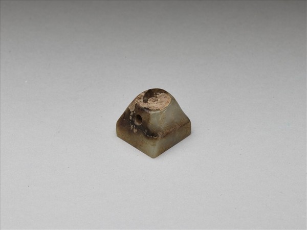 方印,壇鈕,上方平台成圓形,鈕身中心有一橫向對穿。表面有作色,呈棕色。