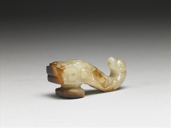 玉質,帶鉤尾及鈕呈深褐色,鉤身局部有淺褐色斑。帶鉤,鉤頭立雕鳥首,圓眼,尖喙;鉤身呈梯形,尾端至鉤身處雕獸面,大眼,鼻翼寬而突起,耳後雙角陰刻扭絲紋,雕琢細緻。帶鉤為古代服飾件,用以固定腰間革帶,此件尺寸小巧,現收儲於多寶格中。