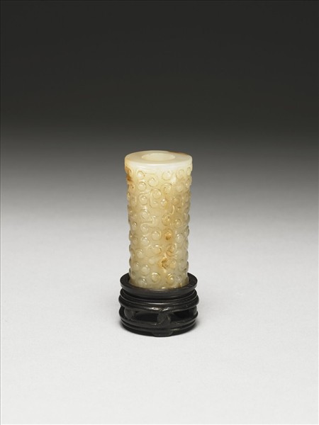 玉質,局部帶褐斑。管狀,下端略窄,器面琢勾連穀紋。清宮為其配座,並儲於多寶格中。