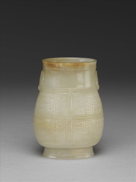 器身橢圓,雖似戰國壺形,口至腹弧度變化較小,絡紋平整,繩相交處以圓扣代替繩結,勾雲紋排列整齊,刀法拘謹,器身厚度修整平均且平順。座上刻篆字方印:「墨林山人」、「項子京印」,座底陰刻隸書填金李文甫款書。據《長物志》卷七〈論銅玉雕刻器皿〉條,李文甫是吳中雕刻高手,擅刻白玉、琥珀、水晶、瑪瑙等。