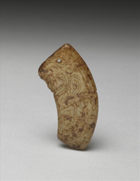 青玉雕刻而成,玉質溫潤,受沁染而帶深淺褐色斑點。全器為一帶弧形片狀,兩端寬窄不一,較寬一端有穿孔;器表刻側身神人面紋,雙面紋飾對稱。