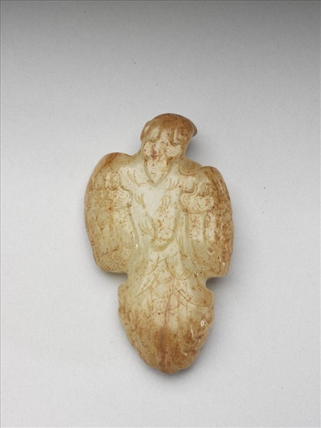 白色玉質,斂足臥伏在地,平底設計可能是為了作為杖頂之用。細察羽翅,還可看到桯具精細去料所留下的圓凹痕跡。