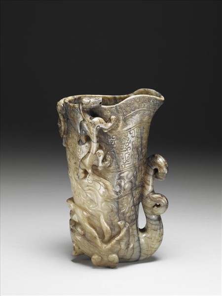 觥原意是指兕角,也就是牛角形的飲酒器。王黼撰《重修宣和博古圖》卷十六有「漢犧首杯」,圖繪牛角形杯。明末清初仿古的風氣下,雕玉的螭龍紋觥常出現在收藏家手中(王士禎,《池北偶談》卷二十六〈九尾觥〉)。高宗對內廷舊藏牛角形觥很有興趣,多次為明末清初的玉觥題詩,這件〈雕玉龍尾觥〉就是其中的一件。底部為龍首張口銜觥,龍尾附於觥側,三隻螭龍攀附觥身,或向上挺進,或迴身向下,或伸首高過口沿。觥身下段刻獸面紋,中段為勾連紋,口沿為穀紋,器形與紋飾雖以漢為仿本,然均大加變形,刻意強調頓拙的趣味,另有一份凝滯的厚重感。高宗在乾隆四十六年(1781)為這件玉觥寫了一首詩:「龍首銜觥當,龍尾貼觥身。三螭相蜿蜒,猶未具角鱗。追琢具古法,代古冺琢痕。而何出入土,乃復遭陸渾。因悟物太美,往往多遭迍。剥而弗失貞,是謂全以神。」認為琢玉的痕跡具有古法,又認為玉質曾遭火燒,但不減其神。和闐玉材大量進入宮廷後,高宗更就形狀略欹斜不合方圓者,仿漢製為龍尾觥,「和闐水玉鮮得中規矩為大器者,因就其形狀,雖畧欹邪不合方圓,示藁内府玉人肖漢製為龍尾觥,頗稱雅觀。」(《御製詩五集》卷九十二,〈題和闐玉龍尾觥〉)其器形多作尖底、弧身而略扁、敞口的角形,底部或有獸首造型,鋬及身側為大型立雕螭龍紋攀附,器身亦浮雕數螭龍紋,造型十分古樸。