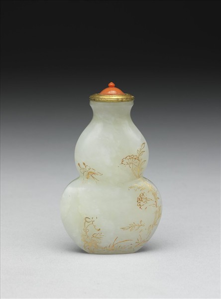 扁葫蘆式,兩面以描金繪石竹等花卉,有蝴蝶與石點綴其間,帶銅嵌珊瑚蓋及銅匙。