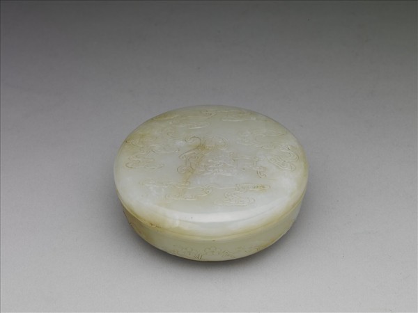 玉質,雜黃色璺。蓋雙鉤雲螭紋,碾法宛轉流動。蓋裏陽刻篆字:「言念君子溫其如玉。」本件有陸子剛的款印。陸子剛是蘇州琢玉名家,十七世紀方志筆記中多提及。