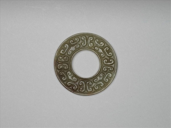 青玉質,琢圓形璧。一面雕勾連雲紋,另面滿飾穀紋。