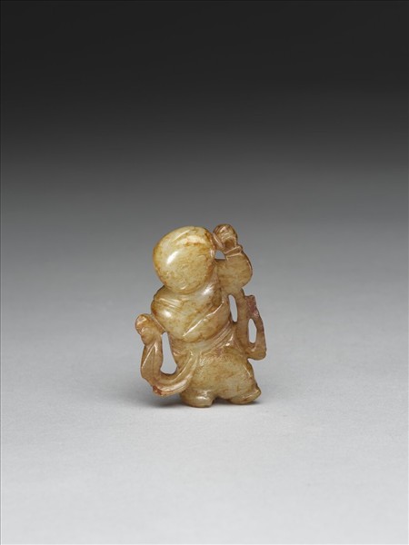 玉質,器表密佈赭色沁斑,立雕一雙手握舉綬帶的童子。童子雙足交叉,右臂垂 彎於胸前,右手往左上方伸展,左臂順勢上舉,雙手握拳,肩披綬帶,繞於身驅左右 兩側,帶尾往上飄,其右方綬帶略傷殘。左手拳起,手心鑿一穿,右手亦握拳,並鑿 一穿直通至雙足之間。淺雕八字形雙眉、雙眼、鼻、唇,頭頂正中淺浮雕出一綹頭髮,陰刻髮絲;身著菱格紋寬大長褲,雙腕戴釧,足穿小鞋。全器正面平緩,背與臀隆起,似取一三角柱狀玉子隨形雕琢而成。童子右手心至雙足之間鑿一通心穿,說明此器應做墜或珮。