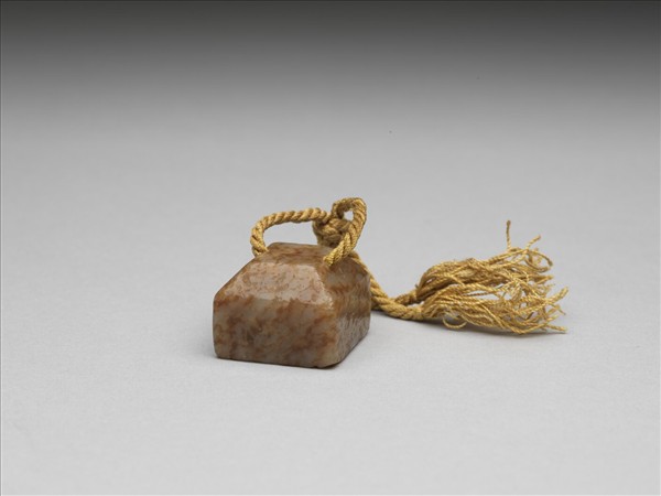 玉質,雜赭斑。方印,覆斗鈕,頂有穿繩,未刻款。