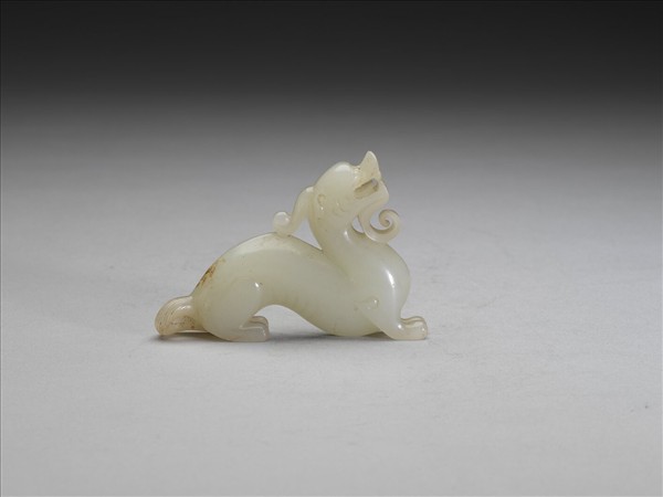 玉質,青白色。琢玉龍昂首伏臥,軀體蜿蜒、靈動。