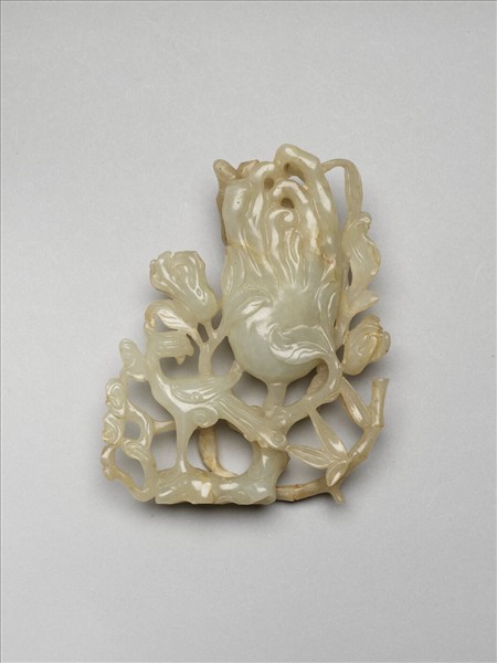 青玉。全器雕連枝佛手,厚皺而光澤,一端琢靈芝鳳鳥,一側雕竹枝。頗富吉祥意味。