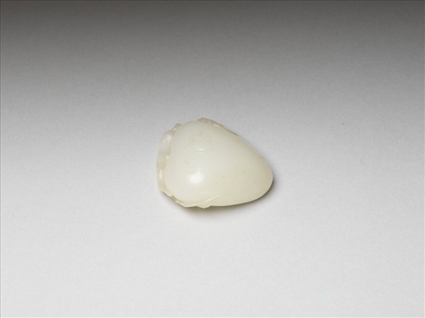 玉質,全器雕桃實,頂有枝葉。附紫檀嵌玉小盒。