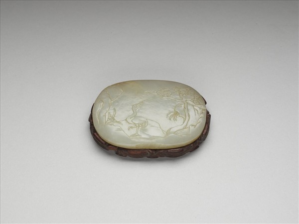 玉質,橢圓形玉片。器表刻松鶴圖,山石空間中,佇立昂首鶴鳥,與蒼勁古松。
