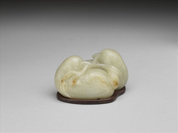 玉質,雕鴛鴦俯臥,兩相對望,共銜花枝。器面陰刻菱格狀鳥羽,底琢屈膝鳥爪。附木座。