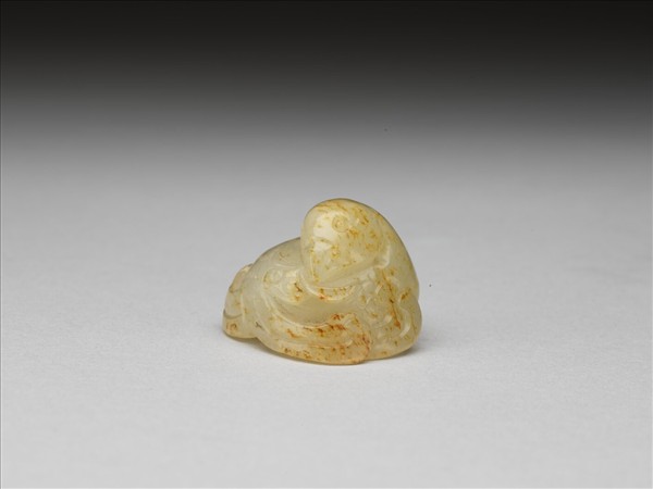 玉質,琢臥姿小鳥。線條陰刻鳥羽,底琢屈膝鳥爪。
