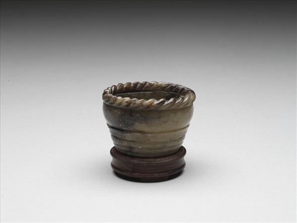 玉質,青灰色。敞口,深弧壁,平底。口沿雕絞索紋,腹壁飾多道弦紋。