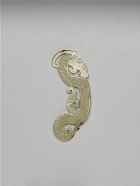 玉質,局部帶赭斑。全器雕S形龍紋,身形扭轉。器面以細線密集交錯,裝飾其多節身驅。