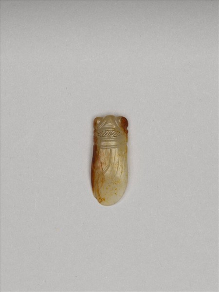 玉質,蟬形。頭部雕圓鼓複眼,以細線勾勒其身軀及蟬翼。