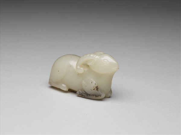 玉質,白色,局部帶黑斑。雕臥姿山羊,小巧可愛。