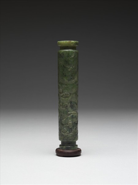 玉質,碧綠色。雕長筒形玉瓶,壁面琢波濤魚紋。底有「乾隆年製」篆書款。附木座。